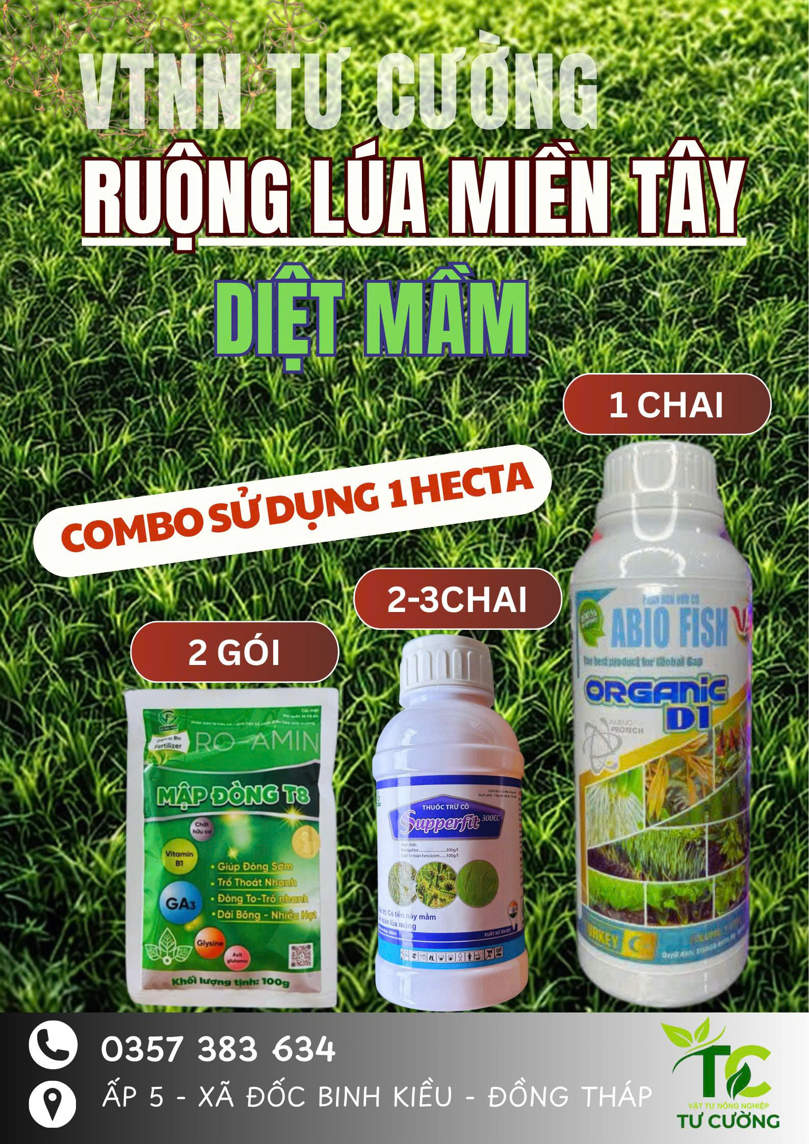 Combo này được giới thiệu để sử dụng cho 1 hecta lúa, bao gồm 1 chai Supperfit, 3 chai Abio Fish Organic D1 và 2 gói Mập Đồng TB.